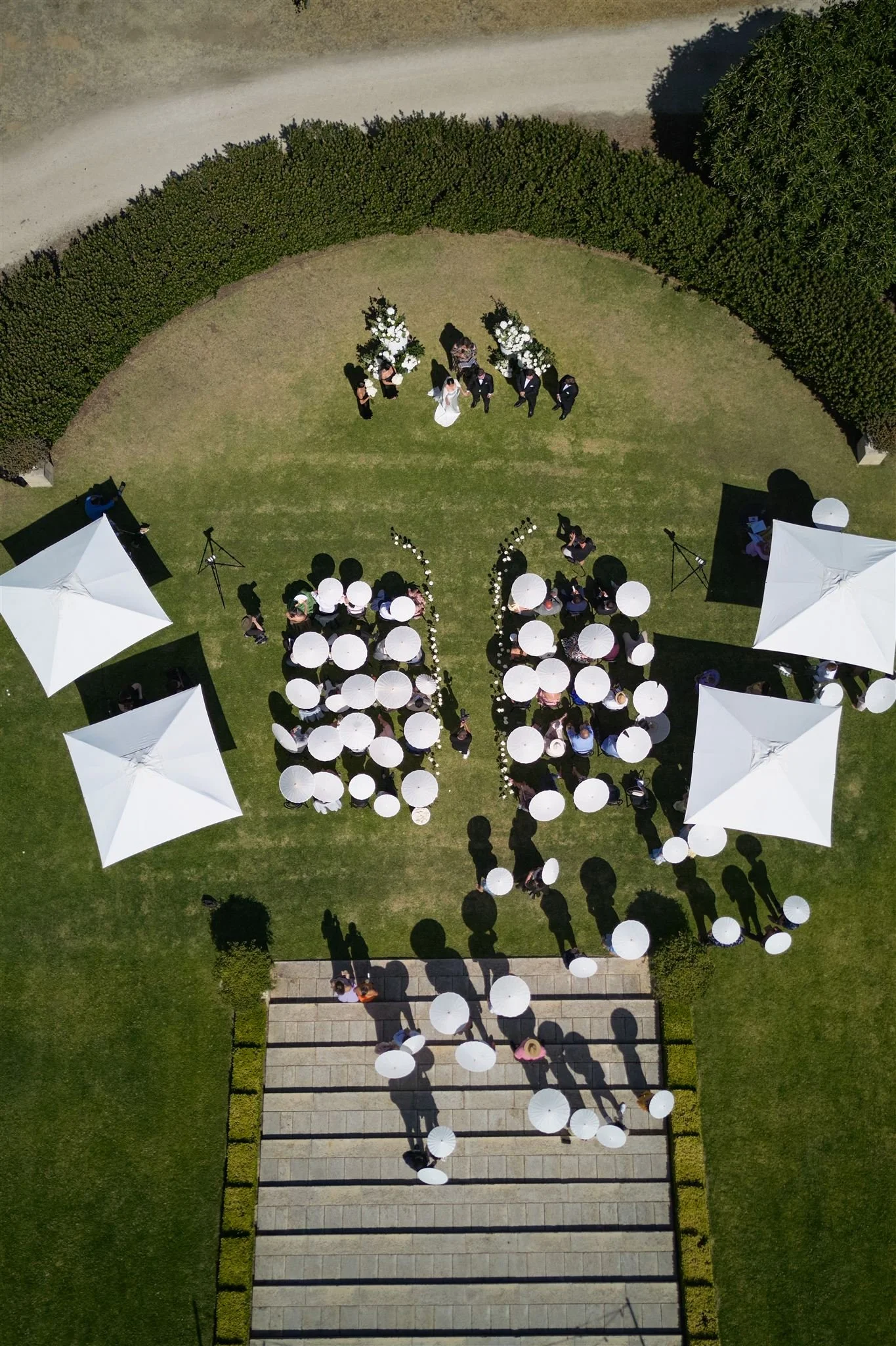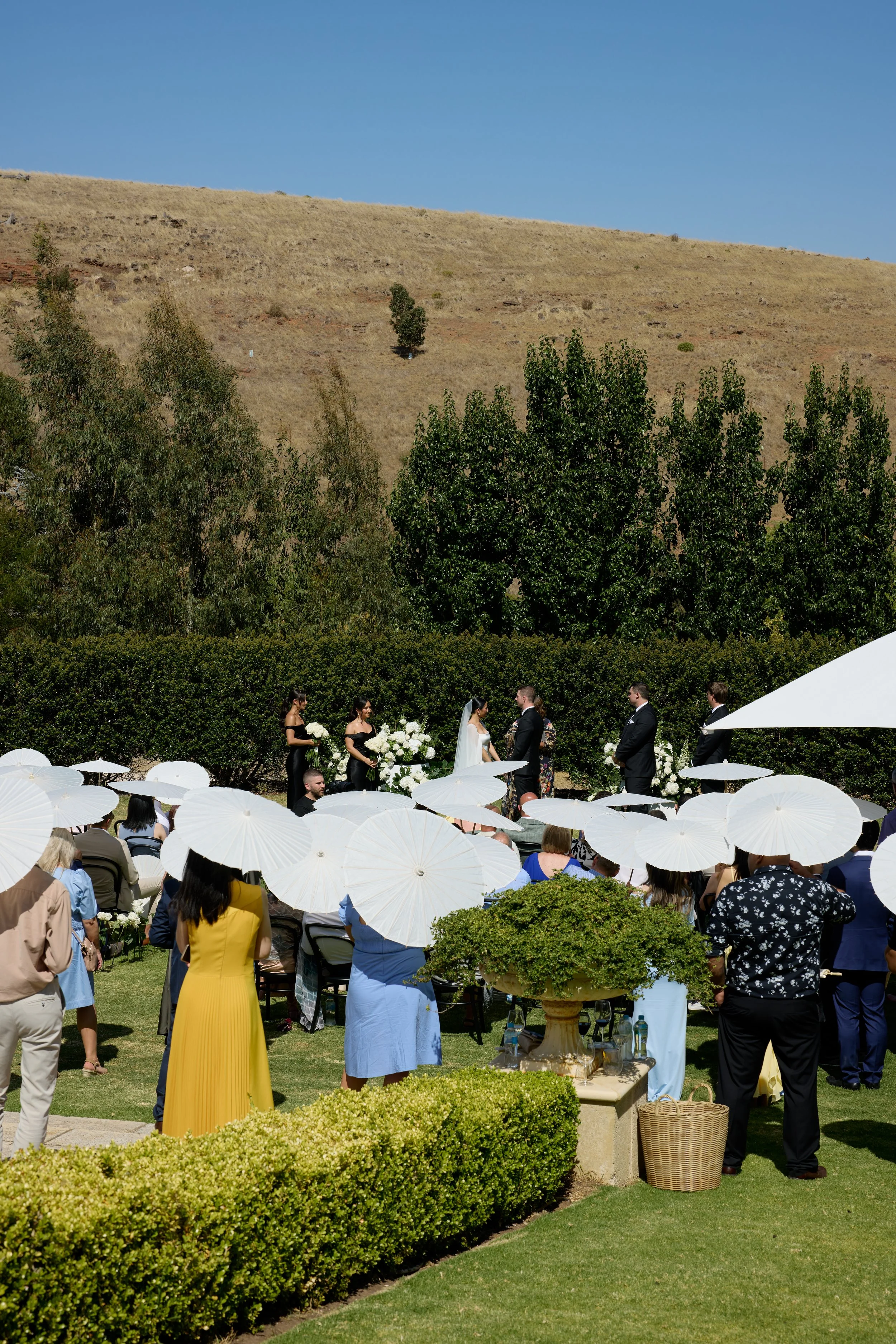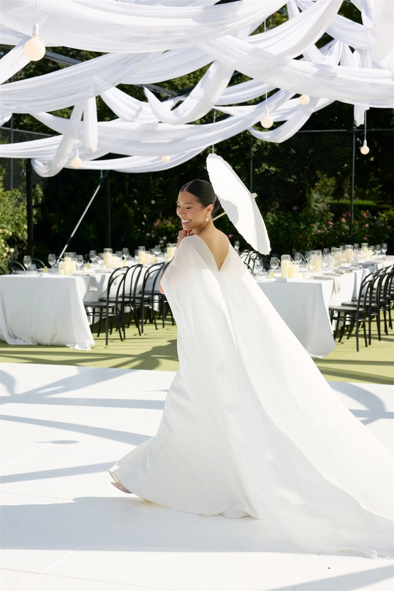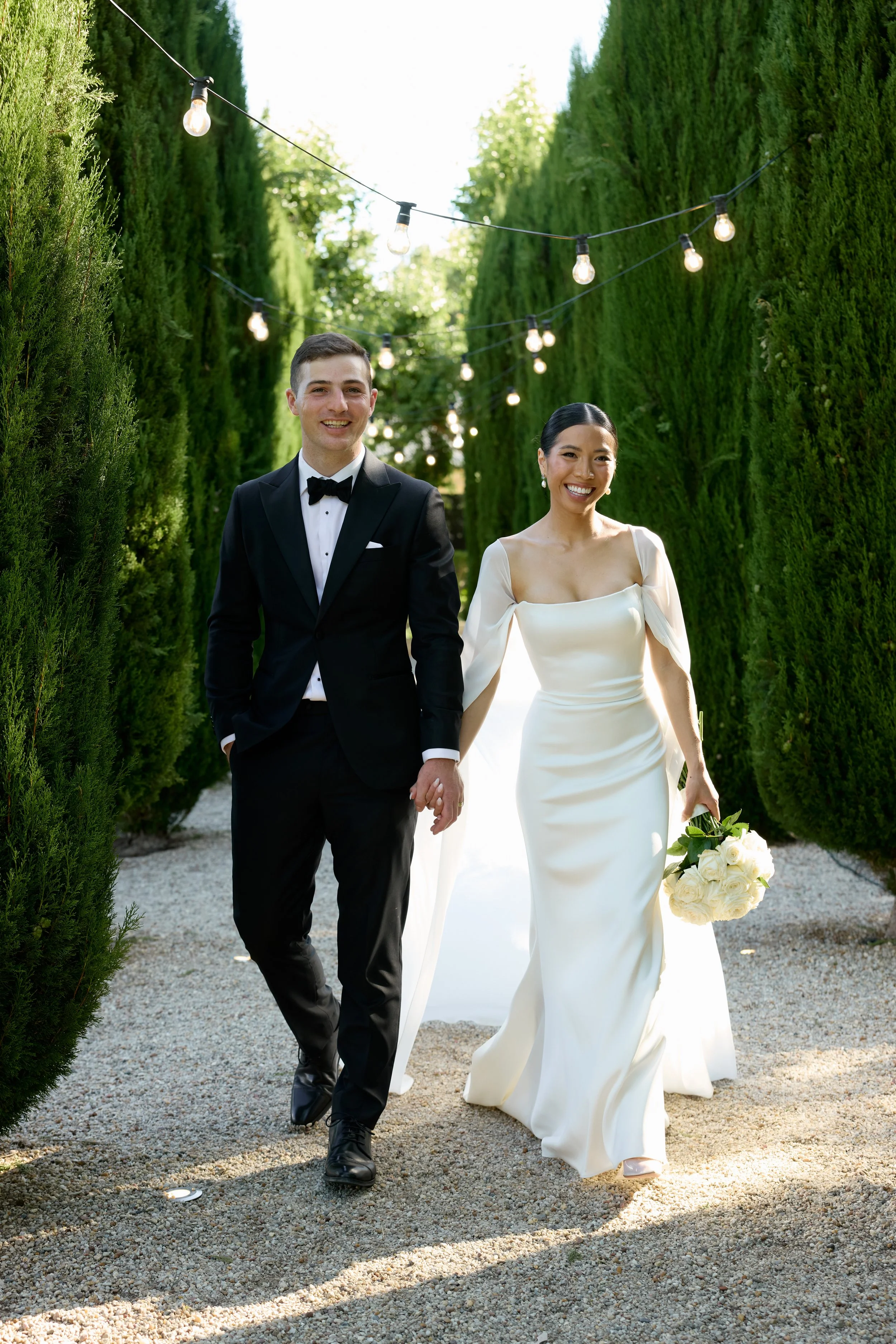 We fell in love with Mandalay House and Garden because we saw so much potential there. We envisioned a day where our guests would feel like they were in a garden, surrounded by nature and natural sunlight. We liked the idea of the drapes flowing in the wind on a balmy summer night, with bits of the sunset peeping through. We hosted our intimate tea ceremony in the Camelia Lawn directly outside the house, then welcomed all our guests alongside the Ivy Barn. The official ceremony was held on the amphitheatre lawn, where I (the bride) had dreamt of walking down an aisle of free-standing roses. To end the night, our reception was on the tennis court. It was very important to us to give our guests a memorable night. We had four signature cocktails made by Derek from Pour Me Another and served gelati by Canela Cartels as a second dessert. The vibe of the night was immaculate. The weather was perfect, everyone was in a great mood, DJ Sami did an amazing job keeping everyone on the dance floor.