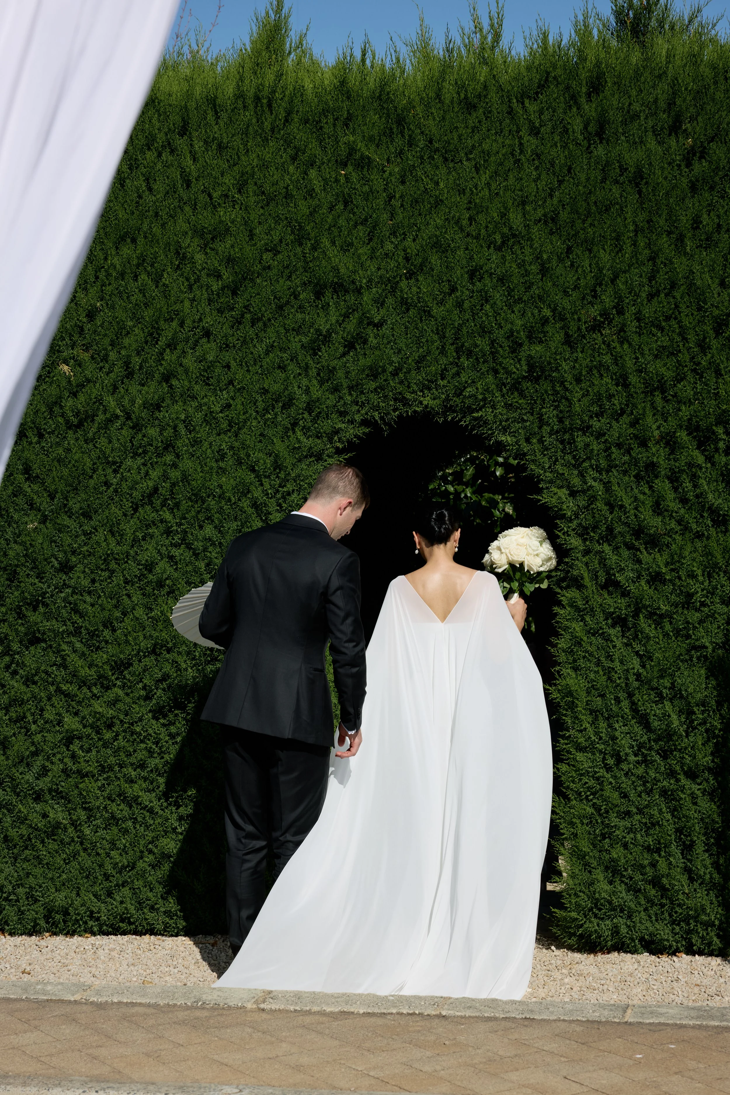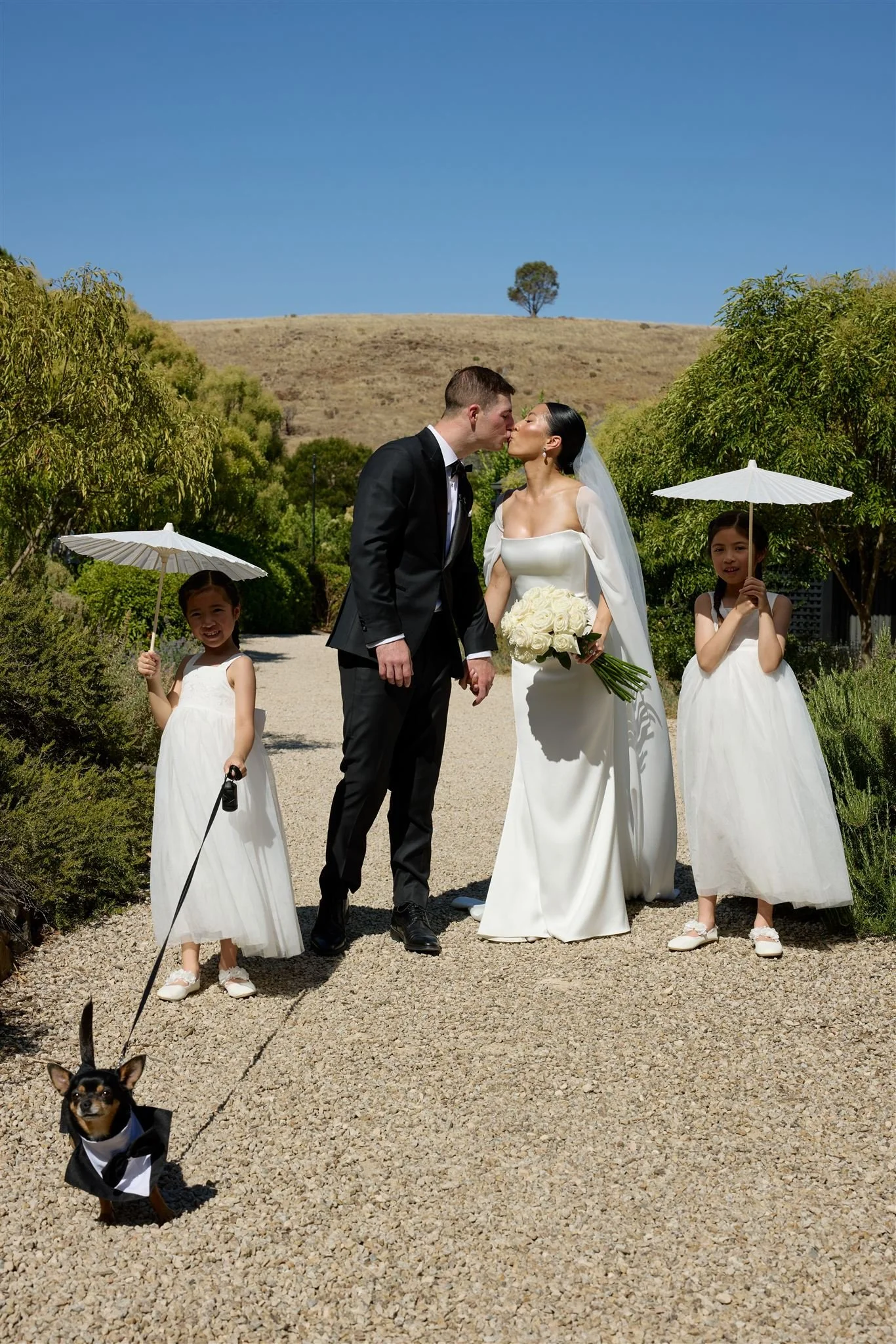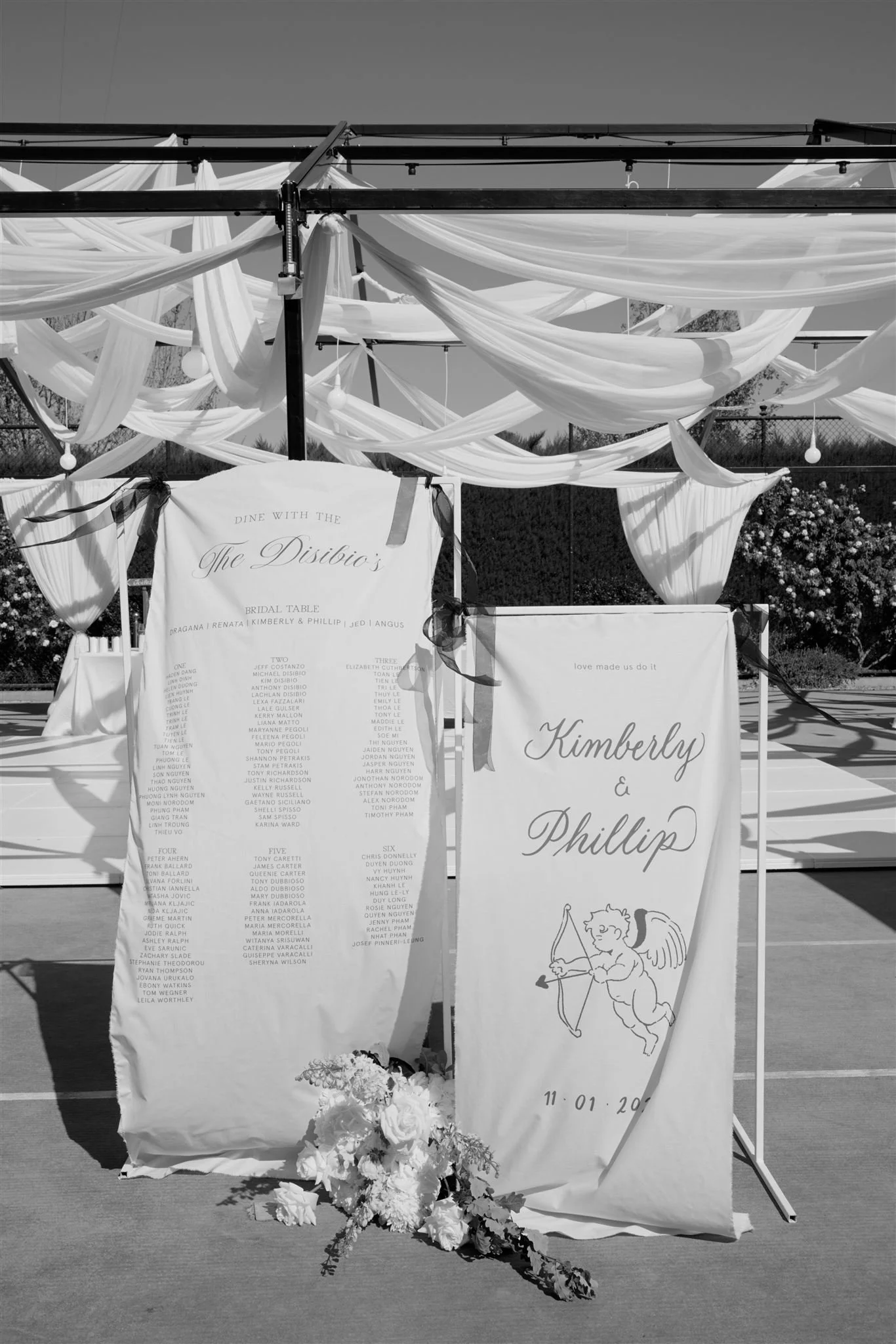 We fell in love with Mandalay House and Garden because we saw so much potential there. We envisioned a day where our guests would feel like they were in a garden, surrounded by nature and natural sunlight. We liked the idea of the drapes flowing in the wind on a balmy summer night, with bits of the sunset peeping through. We hosted our intimate tea ceremony in the Camelia Lawn directly outside the house, then welcomed all our guests alongside the Ivy Barn. The official ceremony was held on the amphitheatre lawn, where I (the bride) had dreamt of walking down an aisle of free-standing roses. To end the night, our reception was on the tennis court. It was very important to us to give our guests a memorable night. We had four signature cocktails made by Derek from Pour Me Another and served gelati by Canela Cartels as a second dessert. The vibe of the night was immaculate. The weather was perfect, everyone was in a great mood, DJ Sami did an amazing job keeping everyone on the dance floor.