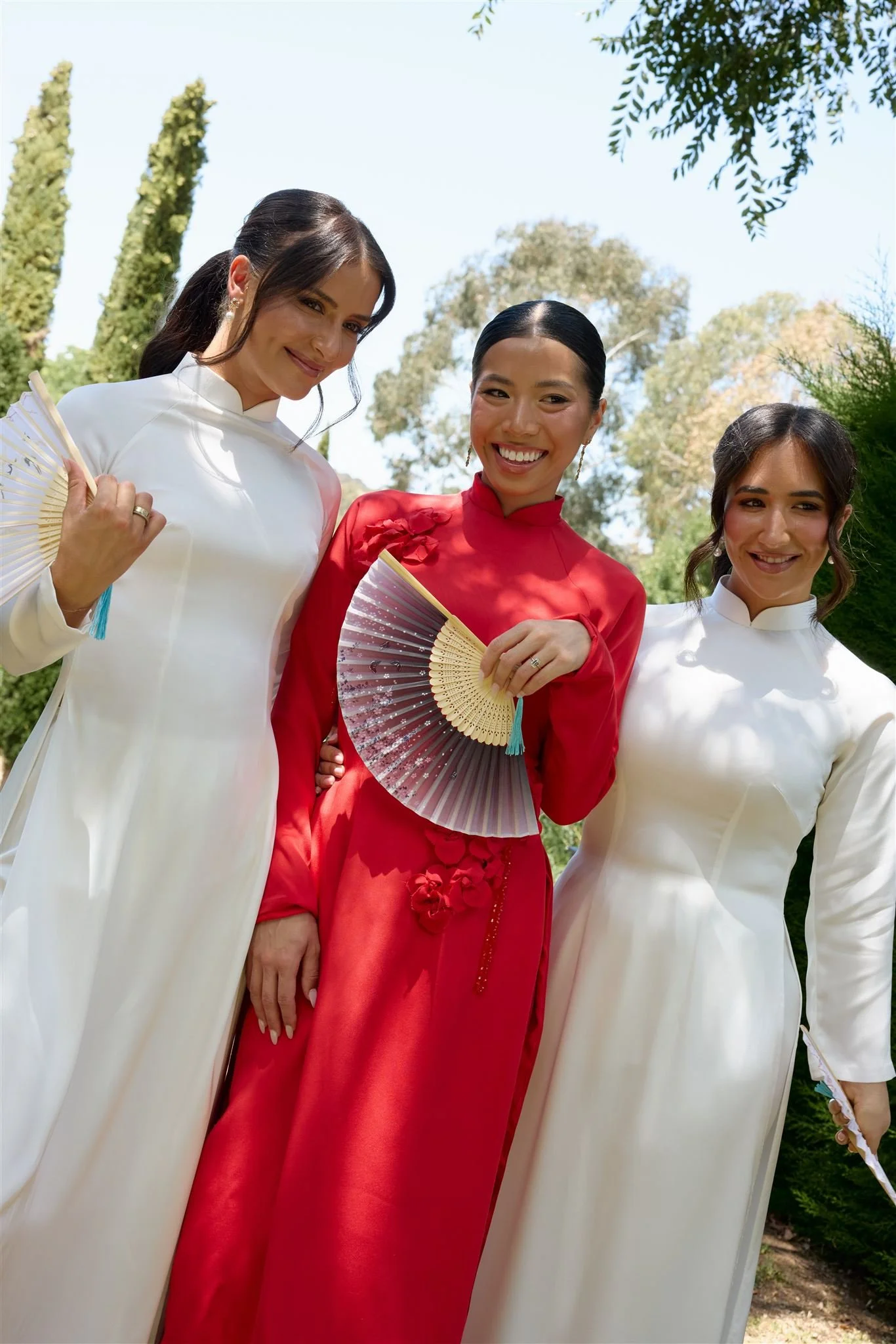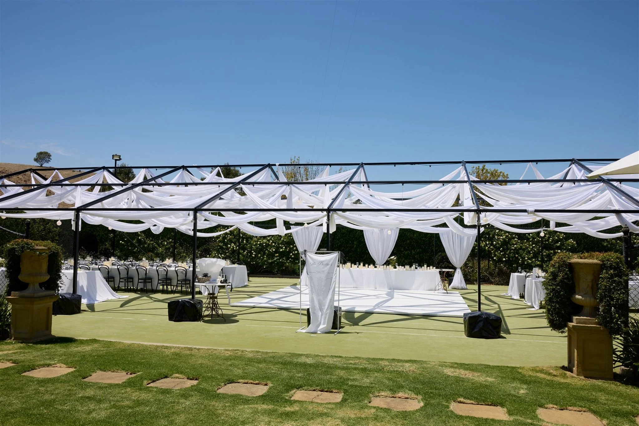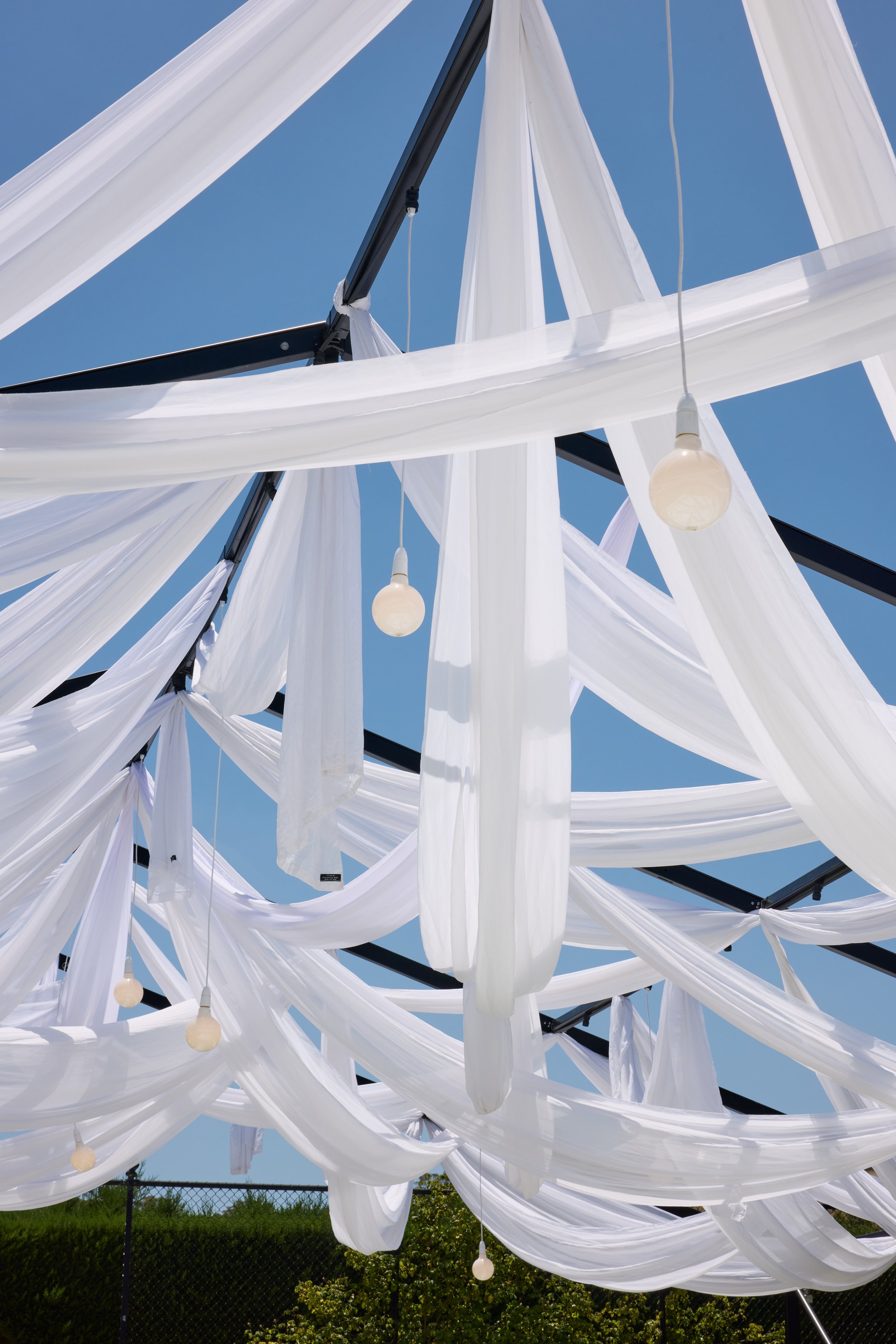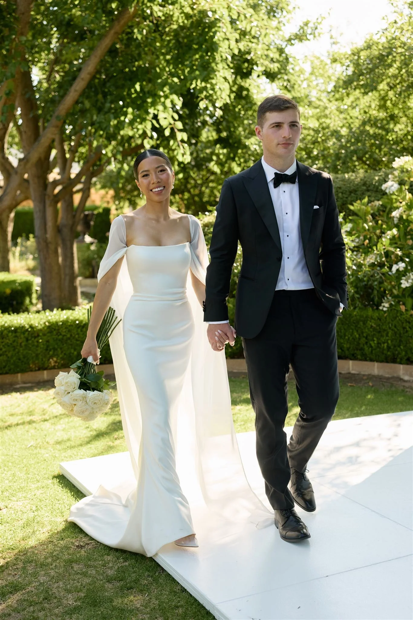 We fell in love with Mandalay House and Garden because we saw so much potential there. We envisioned a day where our guests would feel like they were in a garden, surrounded by nature and natural sunlight. We liked the idea of the drapes flowing in the wind on a balmy summer night, with bits of the sunset peeping through. We hosted our intimate tea ceremony in the Camelia Lawn directly outside the house, then welcomed all our guests alongside the Ivy Barn. The official ceremony was held on the amphitheatre lawn, where I (the bride) had dreamt of walking down an aisle of free-standing roses. To end the night, our reception was on the tennis court. It was very important to us to give our guests a memorable night. We had four signature cocktails made by Derek from Pour Me Another and served gelati by Canela Cartels as a second dessert. The vibe of the night was immaculate. The weather was perfect, everyone was in a great mood, DJ Sami did an amazing job keeping everyone on the dance floor.